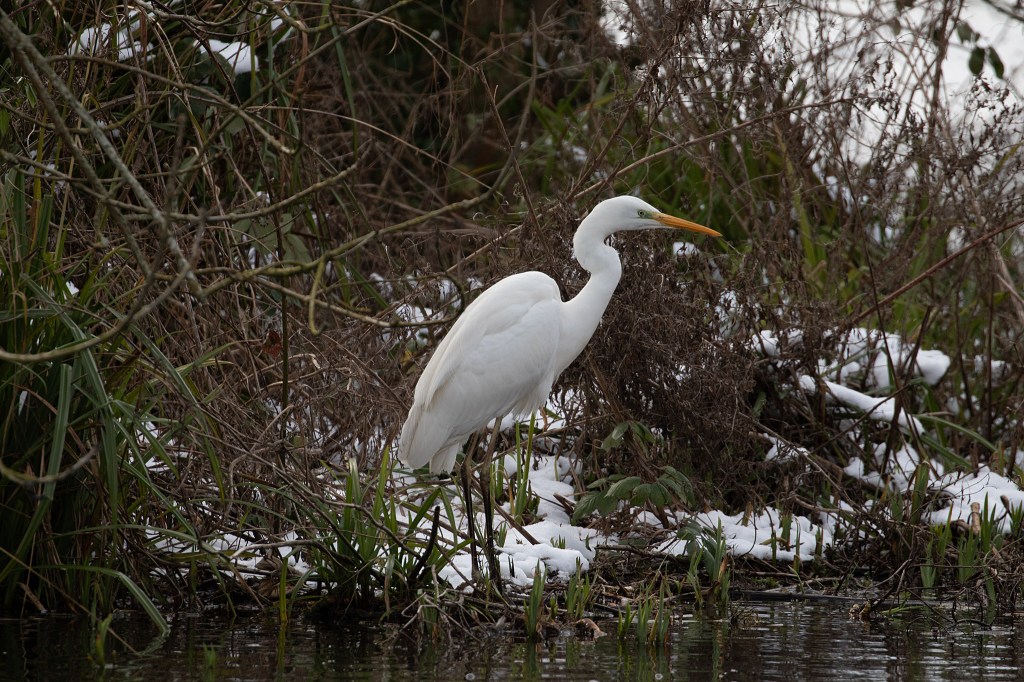 During the recent cold spell we were lucky enough to be visited by a Great White Egret. This large all white heron is about the size of the Grey Heron but more elegant with a longer neck and legs. It is almost twice the size of the more familiar Little Egret. In most years the Great White Egret has started to become a regular visitor to the UK. Its numbers have increased in the recent twenty years and it has now started to nest in a few sites in GB. The snow and freezing conditions appear to have forced the egrets off frozen inland wetlands or perhaps triggered an influx from the continent; up to 9 were seen on the coastal marshes in the Faversham area. One of these visited the allotments on Sun 14th Feb. when I was lucky to obtain some photographs. It was, however, seen off by our local Grey Heron that appeared not to want to share its favourite fishing spot!